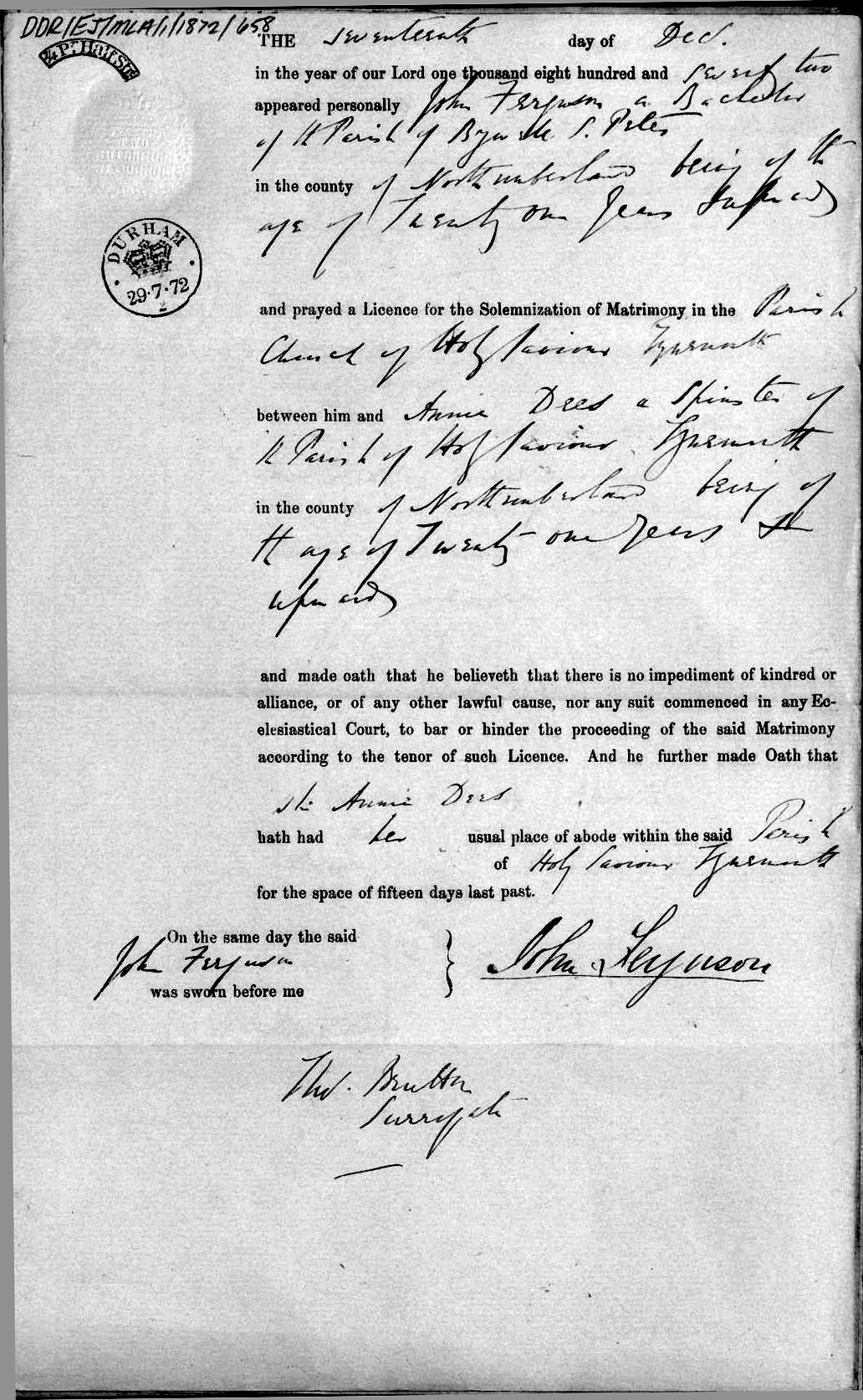 Two interesting historical documents are, however, available. Jean Drakenberg married Mabel Ferguson in Jesmond, Northumberland, England in 1897. They soon thereafter were living in Sweden. An image of the marriage certificate of Mabel's parents, John Ferguson and Annie Dees, has been located and can be viewed here.